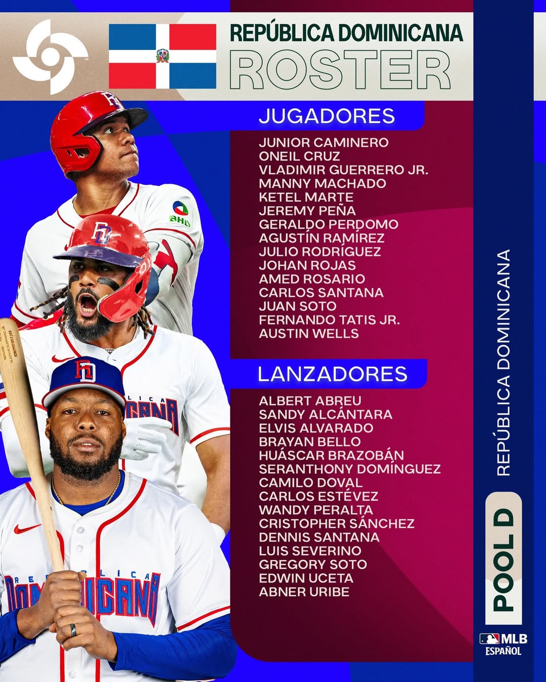 En el cuadro interior, Dominicana cuenta con nombres como Vladimir Guerrero Jr., Ketel Marte, Carlos Santana, Amed Rosario, Manny Machado, Jeremy Peña, Junior Caminero y Geraldo Perdomo.