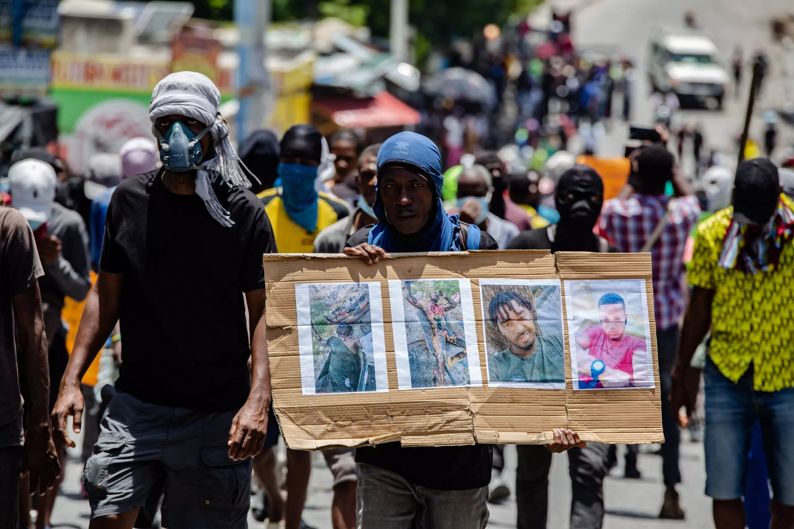 Durante el recorrido de la marcha, se levantaron barricadas con llantas a las que algunos participantes prendieron fuego y se exigió el arresto del expolicía Jimmy Cherizier, alias 'Barbecue', que encabeza la coalición armada conocida como 'Vivre Ensemble' (Vivir Juntos) y que reivindicó la autoría del triple crimen.