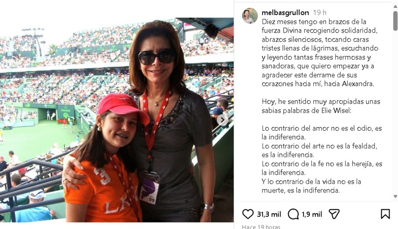 de lágrimas, escuchando y leyendo tantas frases hermosas y sanadoras, que quiero empezar ya a agradecer este derrame de sus corazones hacia mí, hacia Alexandra”, fue el mensaje que escribió Melba Grullón en su cuenta de Instagram, al recordar a su hija Alexandra Grullón.